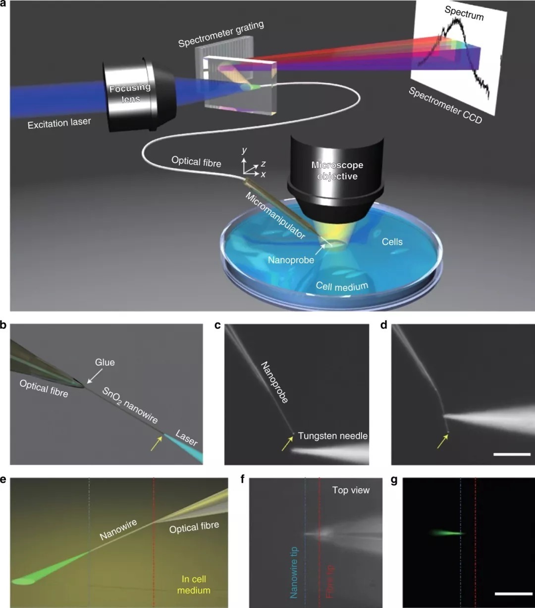标记单个活细胞的物理和化学特性并在体内实时传感 一生物传感的主要目标。尽管生物相容性要求对所使用的微传感器提出了许多挑战,但几种光子微探针和纳米探针技术已成功用于此类应用。成功方法的一个例子依赖于修改具有不同传感纳米结构的光纤,理想情况下不会影响细胞的生存能力。具体而言,已经证明将标记有荧光 CdSe@ZnS 链霉亲和素 QDs(最大发射波长为 655nm)的 SnO2 纳米线波导插入细胞质可用于体内内窥镜检查和受控递送(如图所示)1)。通过锥形光纤的光泵浦将产生位于尖端附近的渐逝场,纳米线在此处被物理切割,因此适用于局部内窥镜检查和光谱分析。