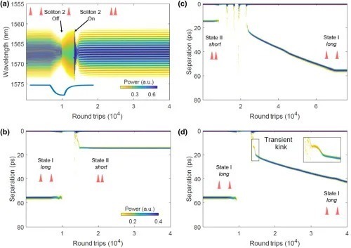摘要:? (a) 从状态I(长分离)切换到状态II(短分离)期间的实时光谱。内腔能量的瞬时降低(插图)溶解了第二个孤子,这在条纹可见度的损失中很明显。